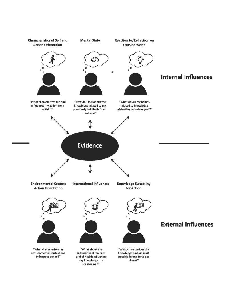 In selecting evidence for action, knowledge brokers described undergoing a reflective decision-making process in which they weighed internal and external factors that may act as barriers or facilitators to change, summarised in in Figure 1. The fit between evidence and the broker’s professional role, their capabilities and world-view were internal facilitators for action. External facilitators included information suggesting that evidence had been successfully implemented in a comparable setting, and alignment with local contexts and international best practices. Health programmes engaged in activities to advance uptake of evidence might develop profiles of health system actors using the figure to assess fit of the evidence to intended audiences.
