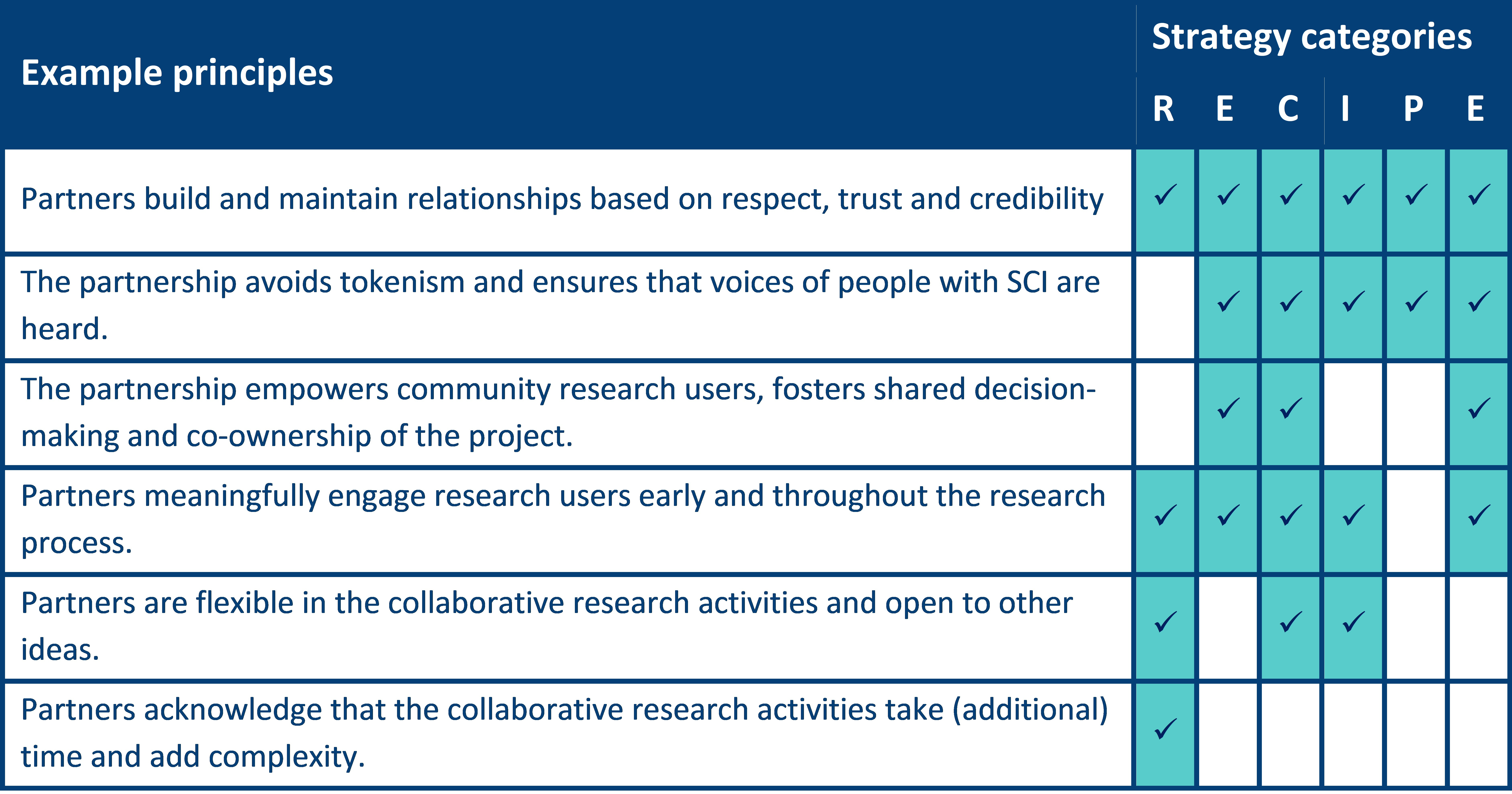 We describe a variety of example principles that can be used to support research partnerships. These principles were identified from interviews with SCI research partnership champions. We found that participants mainly talked about principles related to: