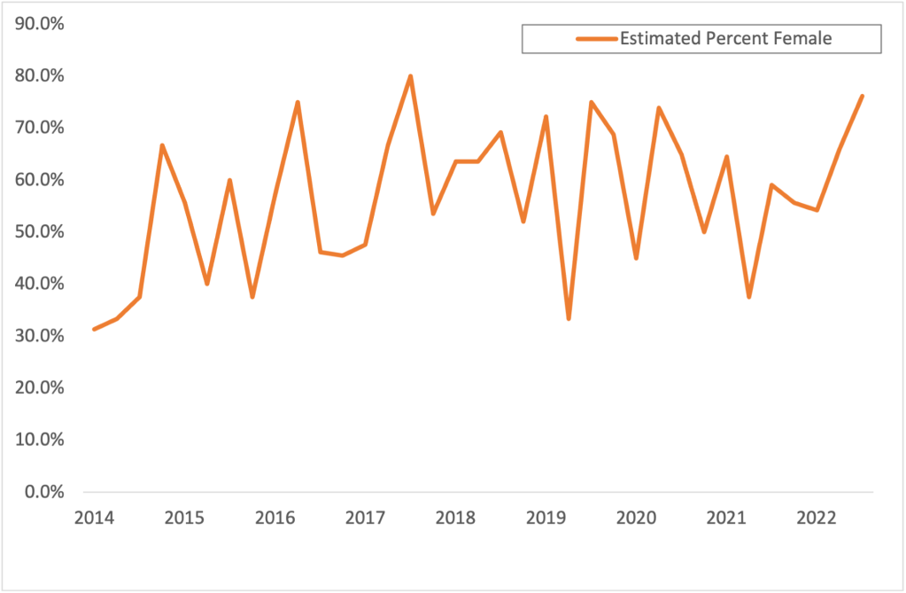 Figure 1. Estimated proportion of female authors published in the “Research” section of Evidence & Policy, 2014-23