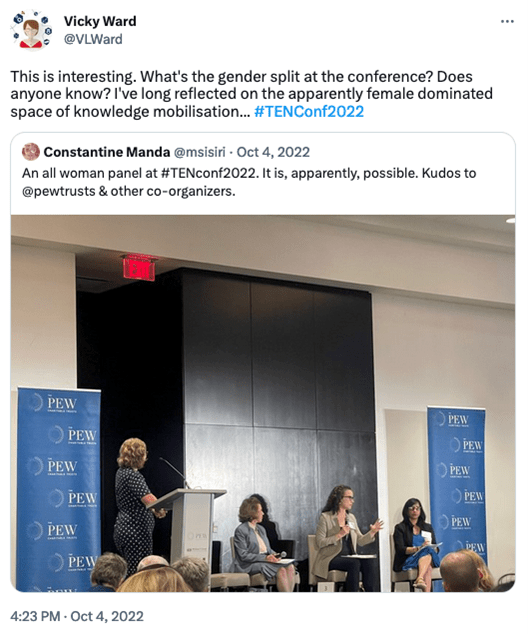 Initially, I did not have a strong hunch regarding the presence or absence of gender differences in the journal: the fields to which we speak are diverse, and so are the constituent groups that tend to turn to Evidence & Policy as a resource. In fact, a recent tweet (here) from the 2022 International Transforming Evidence Network conference—which had strong representation from the evidence use and policymaking areas—asked this question with respect to the conference attendees.