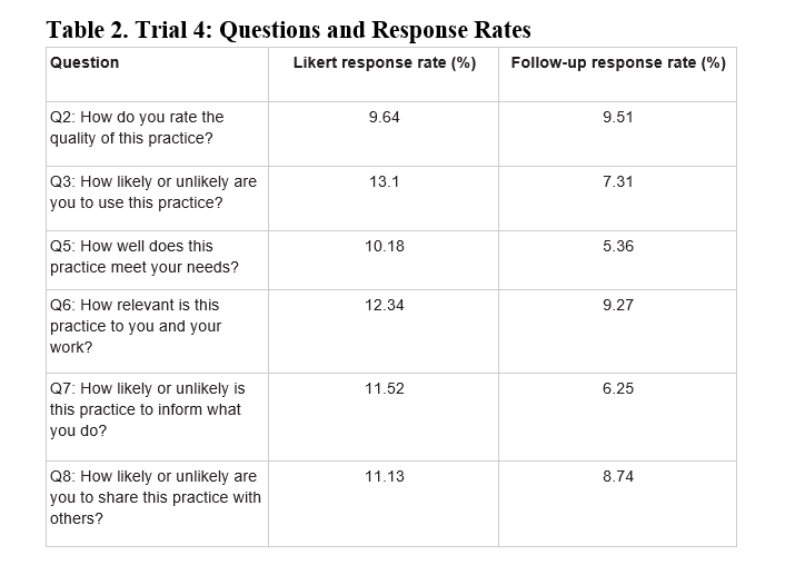 - Short and simple wins. Our first micro-randomised trial tested different questions (i.e., ways of asking for engagement). The most concise question achieved the highest overall response rate (see Table 1).